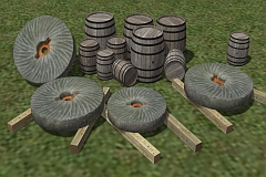 5-teiliges Freemodellset: Diverse Mühlräder und Holzfässer